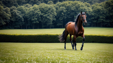 A bay horse galloping freely on lush green grass, surrounded by nature.