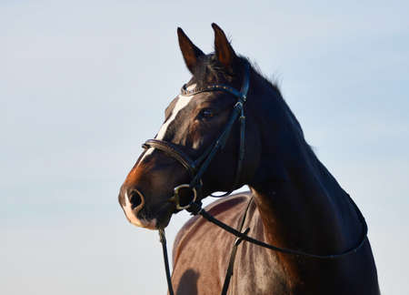 Portrait of a seal brown warmblood horse with a snaffle in the evening sunlight. Sky in the background.