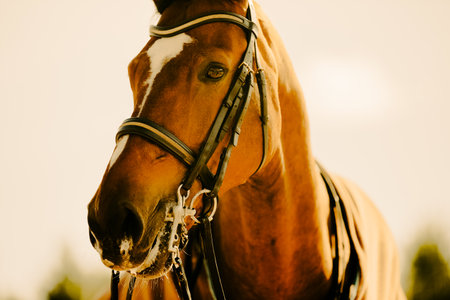 A beautiful portrait of a bay horse in sports gear on a sunny warm summer day. Equestrian sports and horse riding.