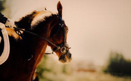 A portrait of a beautiful bay horse, with a dark mane and bridle on its muzzle, on a sunny summer day. The horse is participating in equestrian sports, such as horse riding.