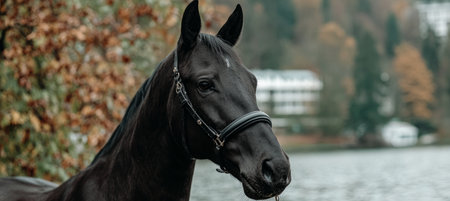 Elegant Headshot of a Majestic Black Horse in a Serene Outdoor Landscape by a Peaceful Lake