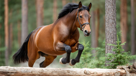 Horse leaping over a fallen log in a pine forest, demonstrating agility and equestrian skill