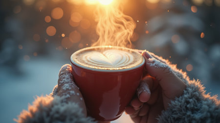 Warm cup held in gloved hand surrounded by snowy landscape during winter