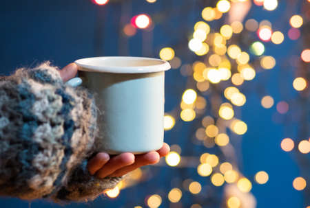Close-up human hands in winter mittens with hot cup of hot mulled wine with spices. Holidays, traditions, winter fair, Christmas concept