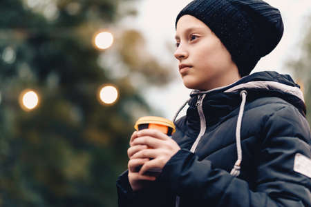 A cute caucasian girl in warm clothes drinks hot tea from a mug while walking in a snowy city park.