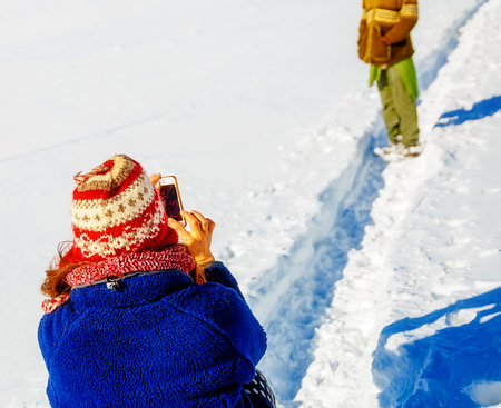 Young girl taking winter nature pictures with mobile phone in the forest