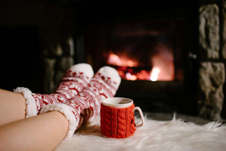Feet in woollen socks by the Christmas fireplace. Woman relaxes by warm fire with a cup of hot drink and warming up her feet in woollen socks. Close up on feet. Winter and Christmas holidays concept.