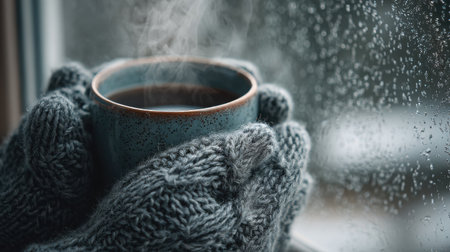Hands in gray wool fingerless gloves cradle a warm cup of coffee by a rain-streaked window, evoking a sense of comfort and tranquility during winter days