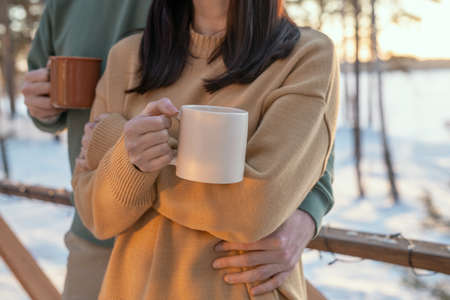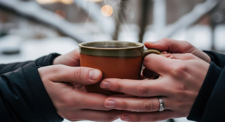 A couple shares a warm drink on a cold winter day, their hands clasped around the mug, symbolizing love, connection, and cozy moments amidst the snowy landscape.