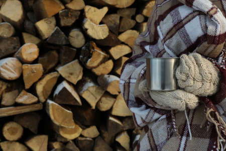 Mulled wine in a red cup in womens hands mittens. Hot winter drink outdoor in snowy winter forest. Christmas background with snowflakes