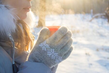 Young Girl in Red Gloves holds a Red Cup with Hot Tea on the Winter Landscape Background with Sunset.