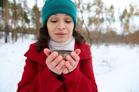 Beautiful middle aged Caucasian woman in green knit hat, red winter coat and white scarf holding a thermo mug from a vacuum flask with hot drink and warming her hands while resting in a snowy forest