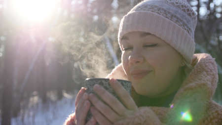 A woman in a knitted hat with a hot drink from a mug to keep warm