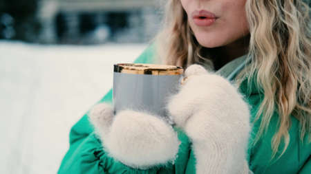 A cute caucasian girl in warm clothes drinks hot tea from a mug while walking in a snowy city park.
