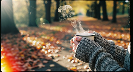 Gloved hands hold a mug of tea, against the backdrop of autumn foliage. Late autumn.