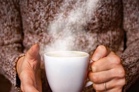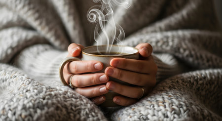 Close-up of hands holding a hot, steaming cup of coffee wrapped in a warm, grey knitted sweater. The image conveys a sense of comfort, relaxation, and protection from the cold weather.