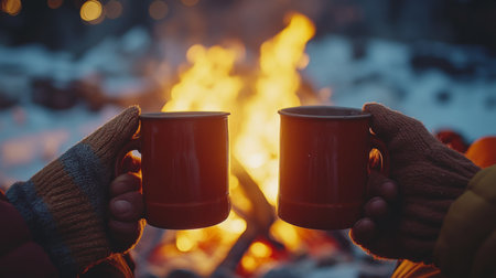 Cozy winter evening by the campfire with steaming mugs in hand, celebrating nature and warmth. Generative AI