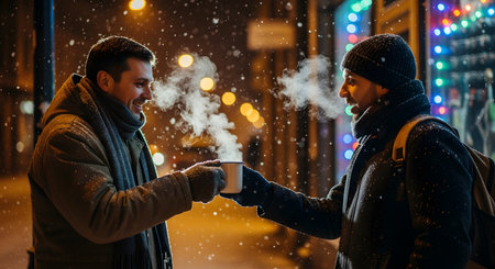 Two happy men engaged in conversation while holding steaming mugs on a snowy city street at night. Dressed in warm winter coats and beanies, they enjoy a hot beverage and social connection amidst the falling snow and festive lights.