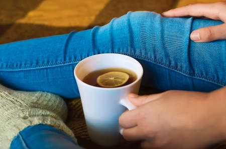 A young man holding a Cup of tea and lemon. Cold, cold, disease.