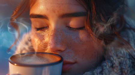 A close up of a woman smelling a cup of coffee, her nose twitching with excitement. Her jaw relaxes as she takes in the aroma, a smile forming on her lips AIG50
