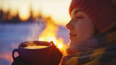 A serene winter scene featuring a woman enjoying a hot drink by a glowing fire as the sun sets, radiating warmth and peaceful vibes.