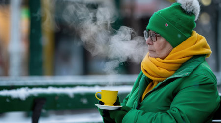An elderly woman dressed warmly in a vibrant green coat and a yellow scarf enjoys a steaming hot beverage in a snowy outdoor setting, showcasing winter joy.