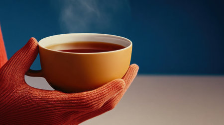 The close up picture of the person holding the cup of the coffee by their own hand to relax near fireplace for relaxation with dark gloomy blur background yet feel warm by the source of heat. AIG43.