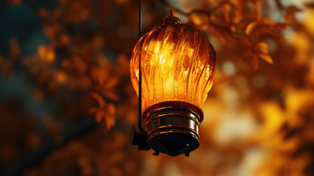 A bright vintage light bulb hangs elegantly against a warm bokeh background, creating a cozy and inviting atmosphere perfect for modern interiors.
