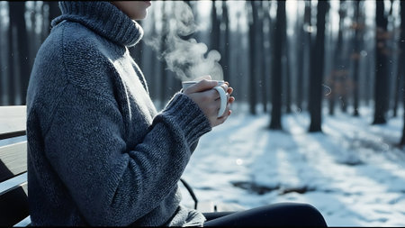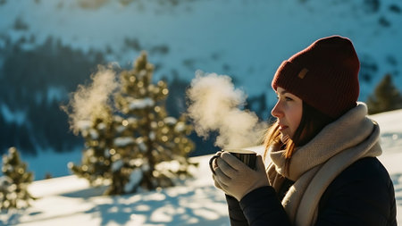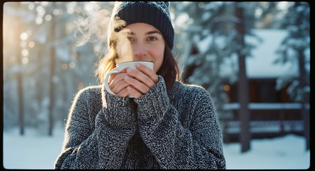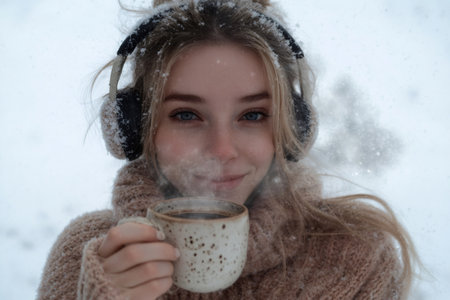 Cozy winter scene with a young woman wearing earmuffs and sipping a steaming hot beverage amidst a gentle snowfall