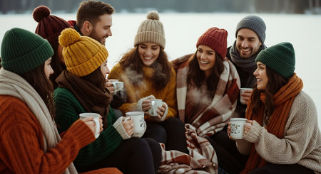 A group of friends enjoying hot beverages in a snowy landscape, dressed in winter clothing, smiling and laughing together