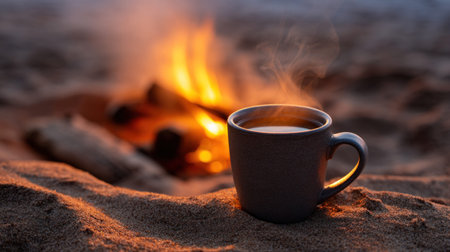 Steaming mug of hot beverage placed on sand near bonfire on beach during sunset, creating cozy and relaxing atmosphere