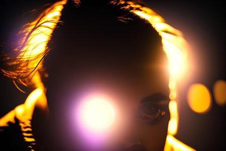 A striking silhouette of a woman's profile illuminated by golden light, creating a sense of warmth and mystery. The hair glows, enhancing the artistic composition of the portrait.
