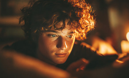 A contemplative young man stands bathed in intense amber glow, casting deep shadows on textured walls, evoking a sense of introspection and artistic depth.