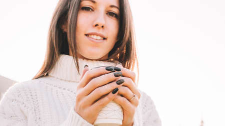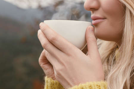 Young woman with cup of hot drink outdoors, closeup