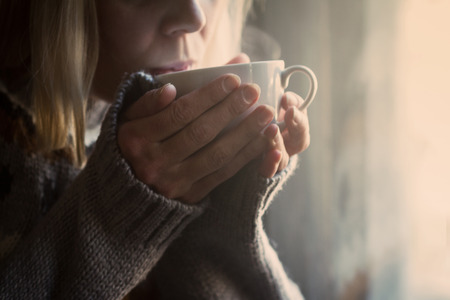 Woman drinking morning coffee, close up of female hands with coffee cup