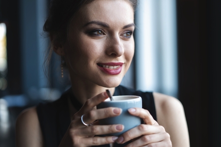 Portrait of gorgeous female drinking tea or coffee and looking with smile out of the coffee shop window while enjoying her leisure time