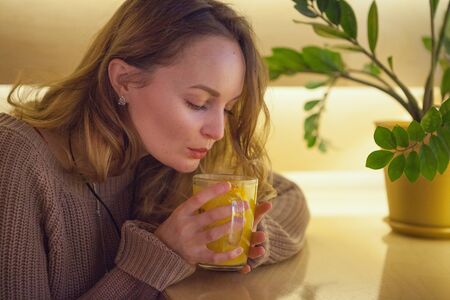 Young woman relaxing indoors at home with cup of coffee or tea.