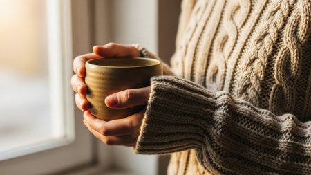 A person wearing a warm brown cable-knit sweater holds a ceramic mug with both hands up to their chest, standing by a window with white trim, soft natural light illuminating the scene