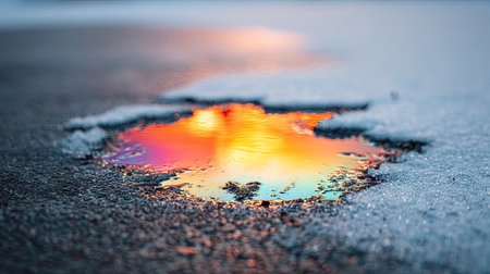 Close-up view of a puddle on a snowy surface, reflecting a vibrant sunset in a spectrum of colors. The puddle's edges are defined by the surrounding snow.