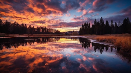 The image features a tranquil lake scene with trees silhouetted against a vibrant sunset. Warm colors paint the sky, with reflections creating symmetry in the water. The composition highlights the natural beauty and serenity of the landscape setting. Hues of orange, gold, and blue create a visually appealing display.