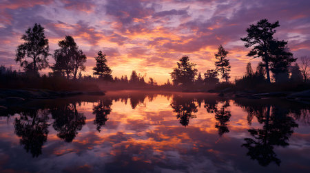 A breathtaking sunset over a calm lake creates a stunning reflection of vibrant colors. Silhouetted trees frame the tranquil landscape, evoking a sense of peace.