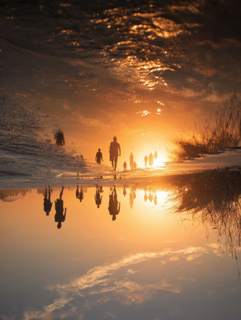 Sunset beach reflection silhouette walking shore golden light reflection in water people walking along shore at sunset with warm golden light and mirrored reflections creating peaceful mood