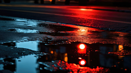 An overhead shot presents the reflection of illuminated lights in a water puddle resting on a dark, wet asphalt surface. The composition showcases cool tones, with the water reflecting soft, glowing circles, contrasted against the rough texture of the pavement. This visual could be used for backgrounds or abstract concepts.