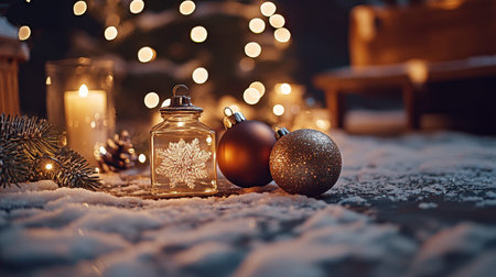 A charming Christmas scene featuring a glowing lantern, vibrant ornaments, and a snowy backdrop, creating a warm and joyful atmosphere for the holidays.