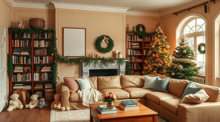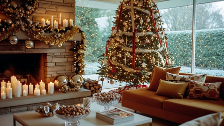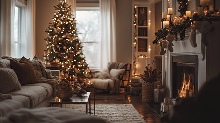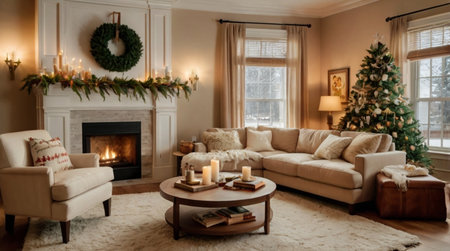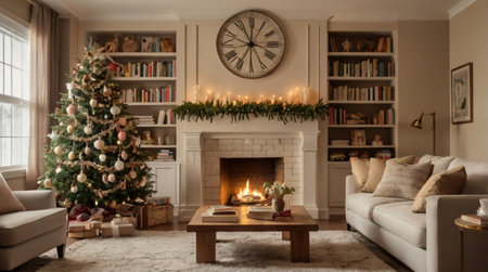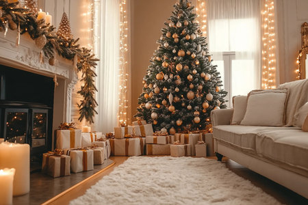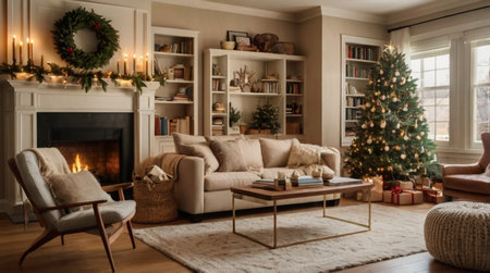 A charming beige lounge with a decorated Christmas tree, evergreen mantle d