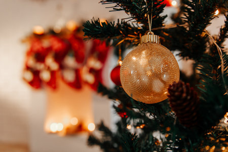 Decorated Christmas tree with beautiful ornaments creates a cozy atmosphere preparing for the cheerful New Year celebration with friends and family.