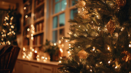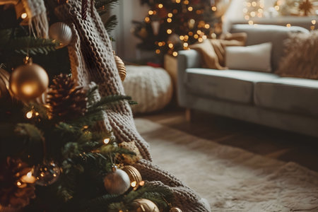A warm and inviting living room adorned with a beautifully decorated Christmas tree. Soft lights and golden ornaments create a festive atmosphere perfect for holiday gatherings.
