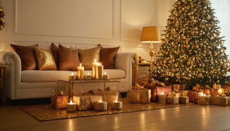 An and Christmas living room is depicted, featuring a beautifully lit Christmas tree as the centerpiece. A plush white sofa with golden cushions is positioned to the side, complemented by a low coffee table adorned with several lit candles, casting a warm, inviting glow. Numerous wrapped gifts, many in gold and textured paper, are scattered around the tree and in front of the sofa. The overall ambiance is festive, and filled with the warmth of the holiday season.