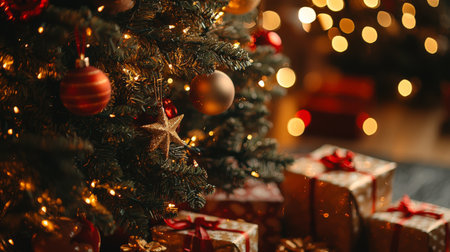 Decorated with colorful ornaments, the Christmas tree stands proudly amidst glowing lights, surrounded by beautifully wrapped gifts, evoking warmth and holiday cheer.