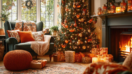 A beautifully decorated living room showcasing a vibrant Christmas tree adorned with ornaments and gifts, exuding warmth from a crackling fireplace.